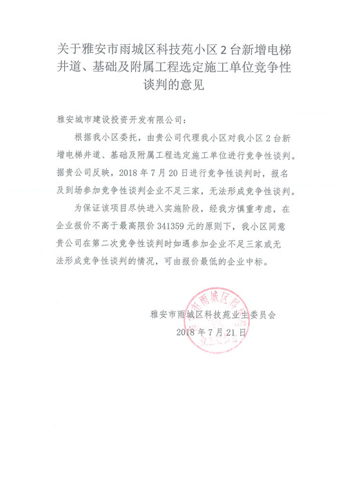 關(guān)于雅安科技苑小區(qū)新增電梯井道、基礎(chǔ)及附屬工程競(jìng)爭(zhēng)性談判的結(jié)果公示