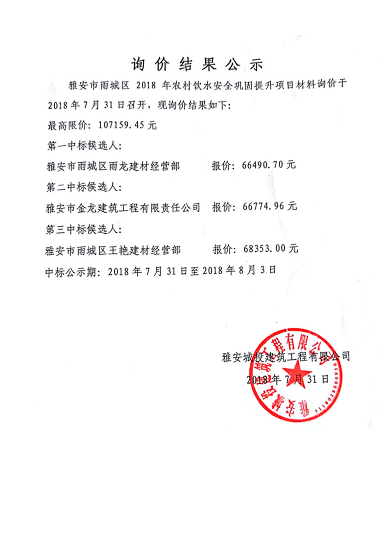 雅安市雨城區(qū)2018年農(nóng)村飲水安全鞏固提升項(xiàng)目材料詢價結(jié)果公示