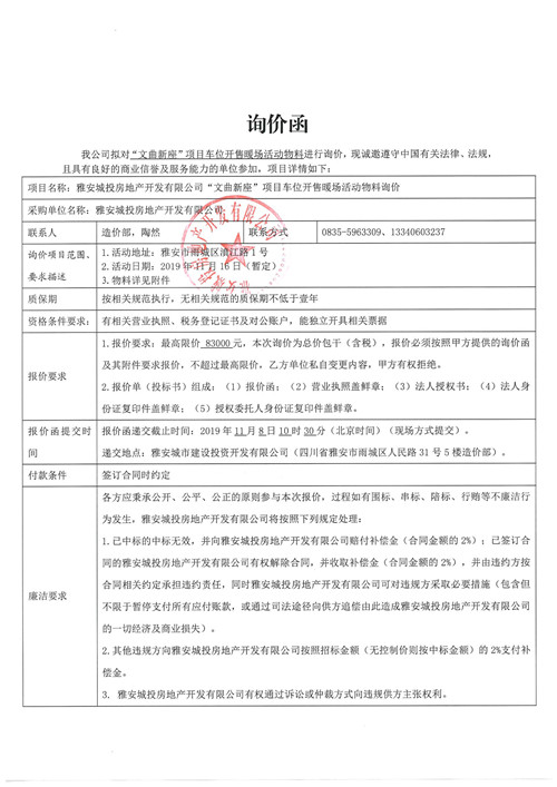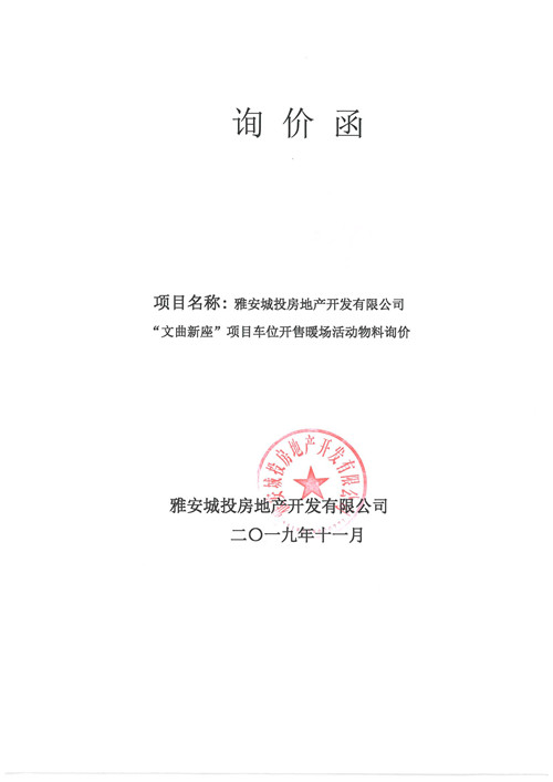 雅安城投房地產(chǎn)開(kāi)發(fā)有限公司“文曲新座”項(xiàng)目車位開(kāi)售暖場(chǎng)活動(dòng)物料詢價(jià)函(第二次)
