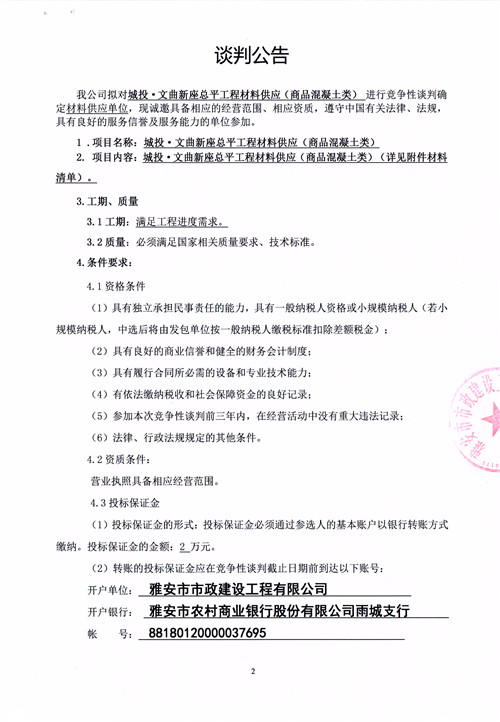 市政公司城投·文曲新座總平工程材料供應(yīng)(商品混凝土類)競(jìng)爭(zhēng)性談判公告