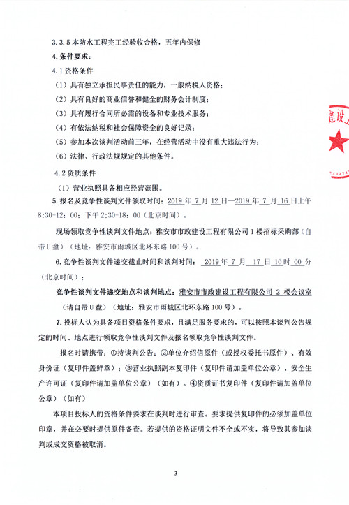 城利水電站屋面防水材料采購安裝工程競爭性談判公告