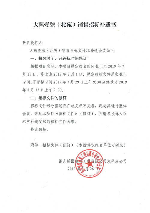 大興壹號(北苑)銷售招標(biāo)補(bǔ)遺書