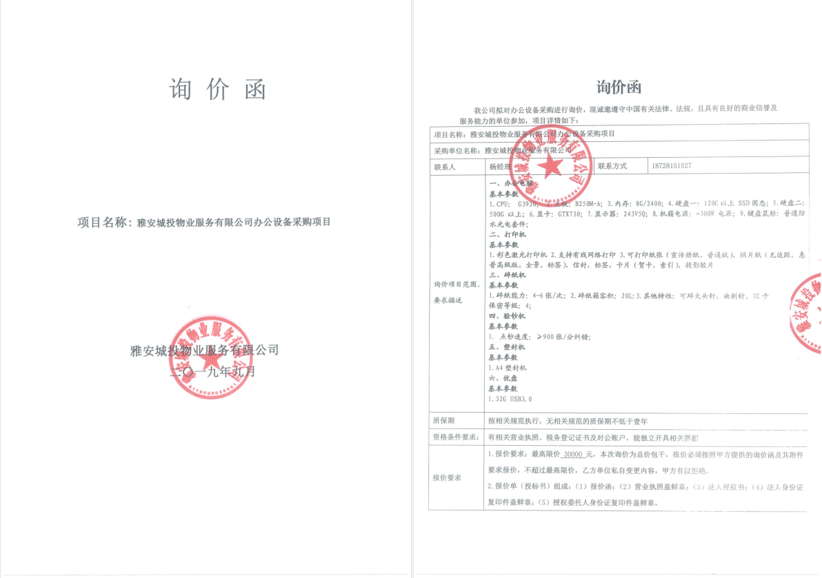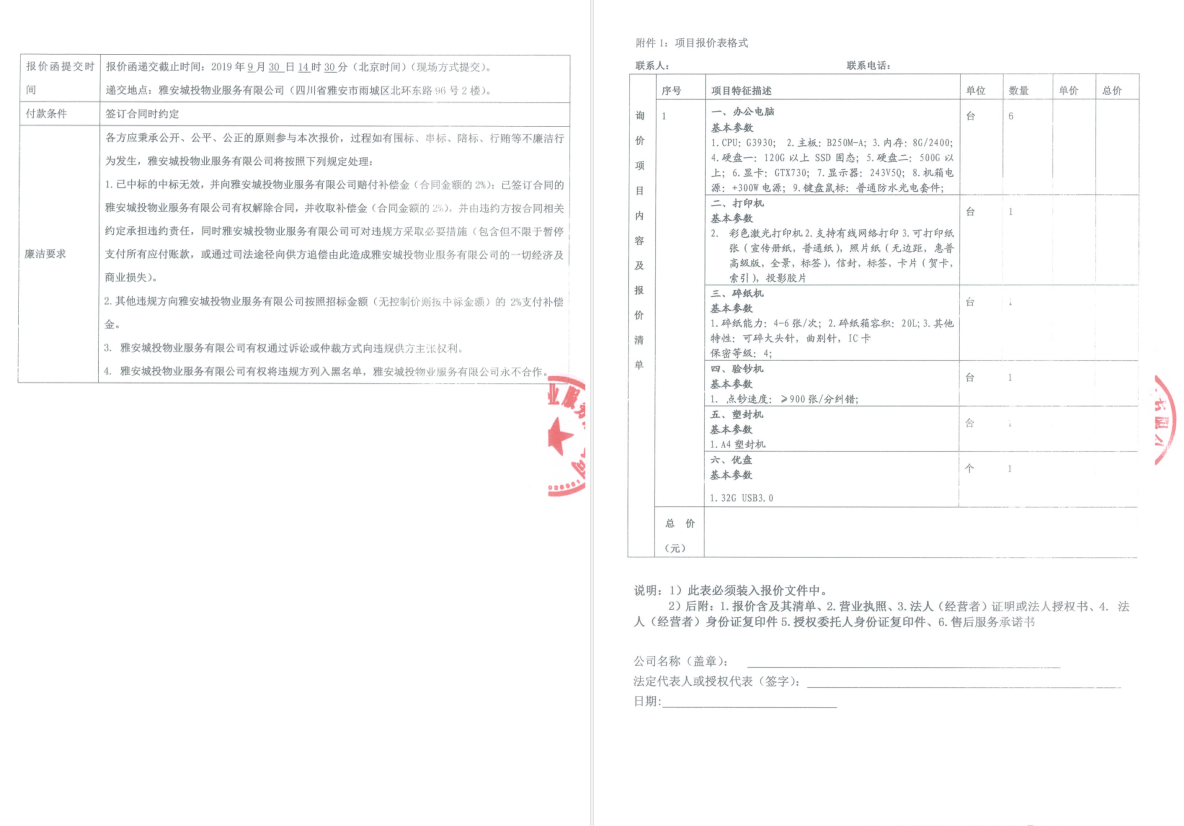 附件:雅安城投物業(yè)詢價函(辦公設(shè)備)