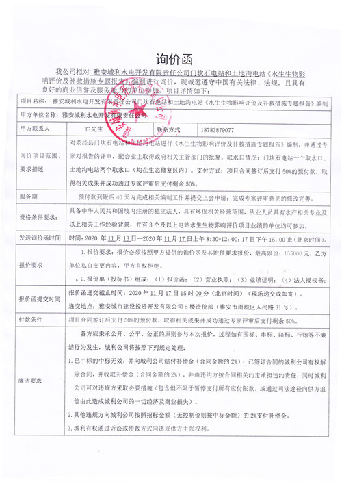 城利水電公司門坎石電站和土地溝電站《水生生物影響評價(jià)及補(bǔ)救措施專題報(bào)告》詢價(jià)函