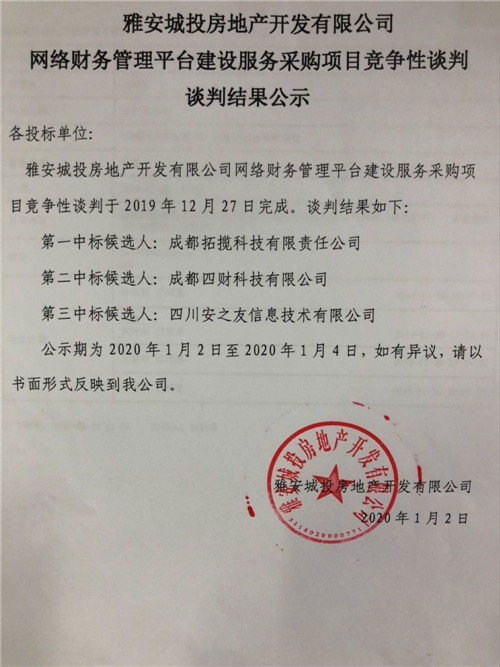 雅安城投房地產(chǎn)開發(fā)有限公司網(wǎng)絡(luò)財務(wù)管理平臺建設(shè)服務(wù)采購項目競爭性談判結(jié)果公司
