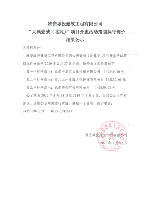 城投建工“大興壹號(hào)(北苑)”項(xiàng)目開(kāi)盤(pán)活動(dòng)策劃執(zhí)行詢(xún)價(jià)結(jié)果公示