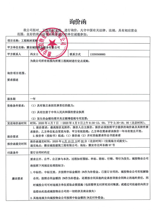 城投物業(yè)公司工程耗材采購詢價(jià)函