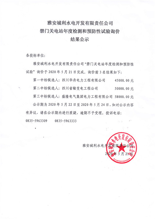 城利水電公司禁門關(guān)電站年度檢測和預(yù)防性試驗(yàn)詢價(jià)結(jié)果公示