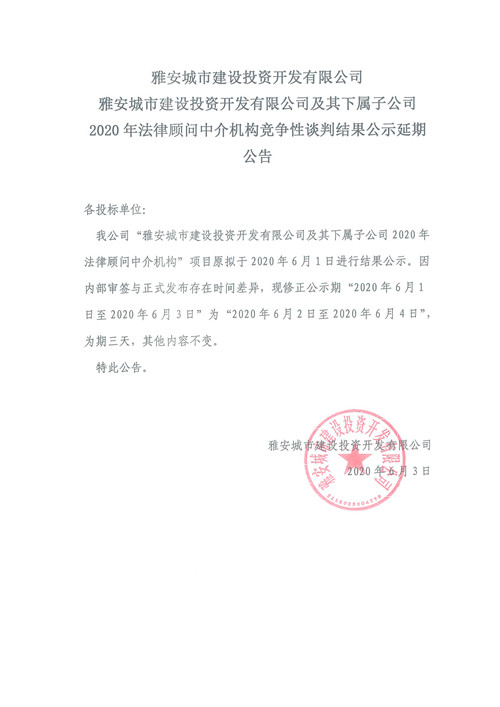 雅安城市建設(shè)投資開發(fā)有限公司及其下屬子公司2020年法律顧問中介機(jī)構(gòu)競爭性談判結(jié)果公示延期公告