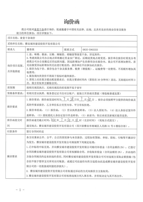雅安城市建設(shè)投資開發(fā)有限公司食堂干雜詢價函
