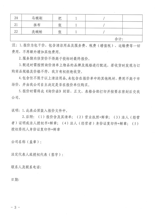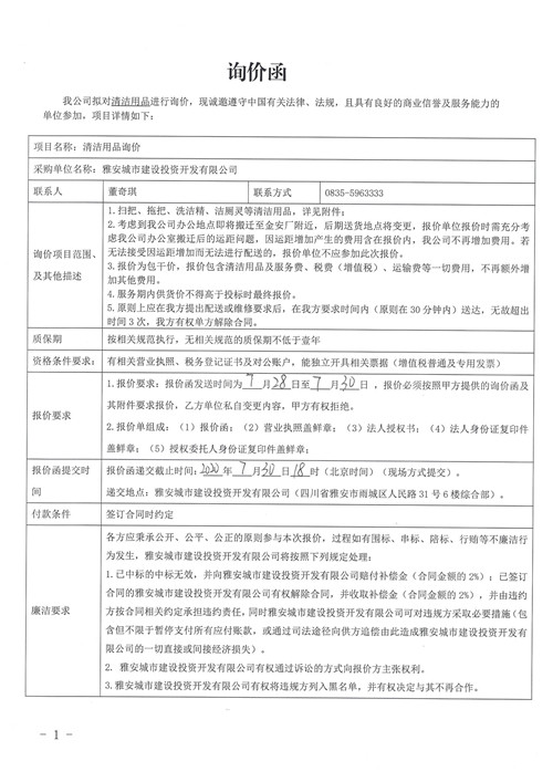 雅安城市建設(shè)投資開(kāi)發(fā)有限公司清潔用品詢(xún)價(jià)函