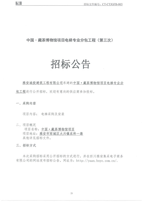 城投建工公司中國(guó)·藏茶博物館項(xiàng)目電梯專業(yè)分包工程招標(biāo)公告(第三次)