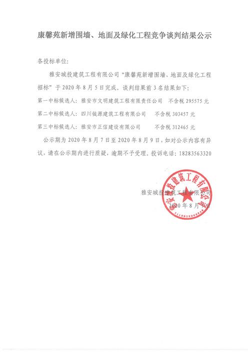 城投建工公司康馨苑新增圍墻、地面及綠化工程競爭性談判結(jié)果公示