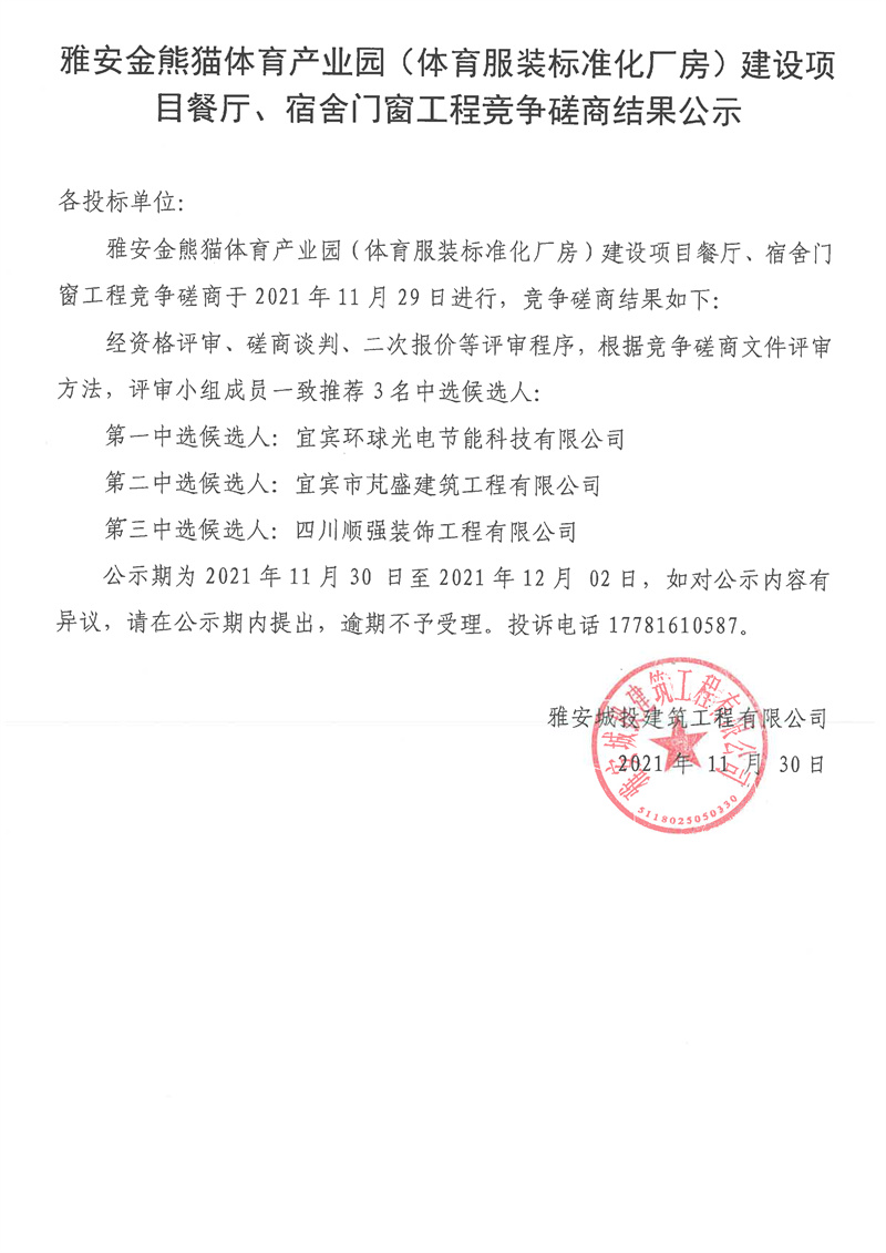 雅安金熊貓體育產(chǎn)業(yè)園(體育服裝標(biāo)準(zhǔn)化廠房)建設(shè)項目餐廳、宿舍門窗工程競爭磋商結(jié)果公示