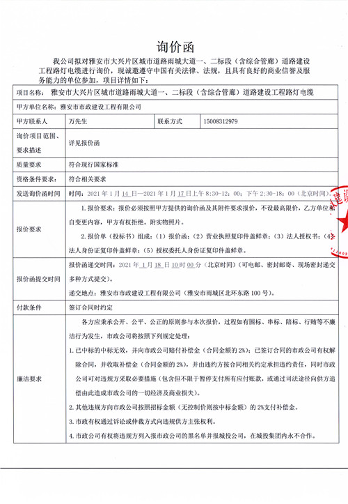 雅安市大興片區(qū)城市道路雨城大道一、二標段(含綜合管廊)道路建設(shè)工程路燈電纜詢價函