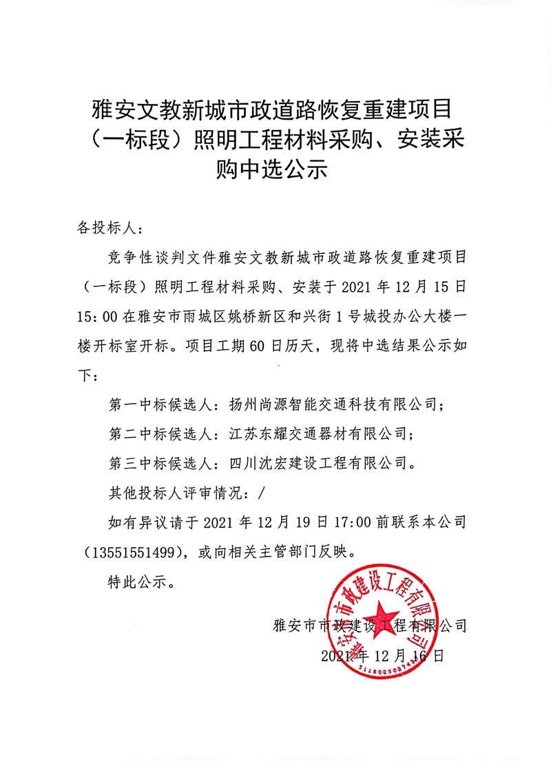 雅安文教新城市政道路恢復(fù)重建項(xiàng)目(一標(biāo)段)照明工程材料采購(gòu)、安裝采購(gòu)中選公示