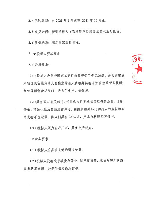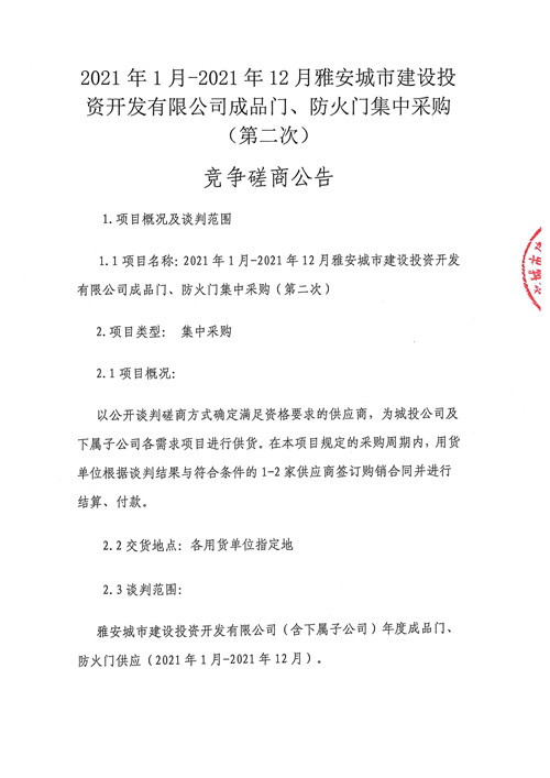 2021年1月-2021年12月雅安城市建設(shè)投資開發(fā)有限公司成品門、防火門集中采購(第二次)競(jìng)爭(zhēng)磋商公告