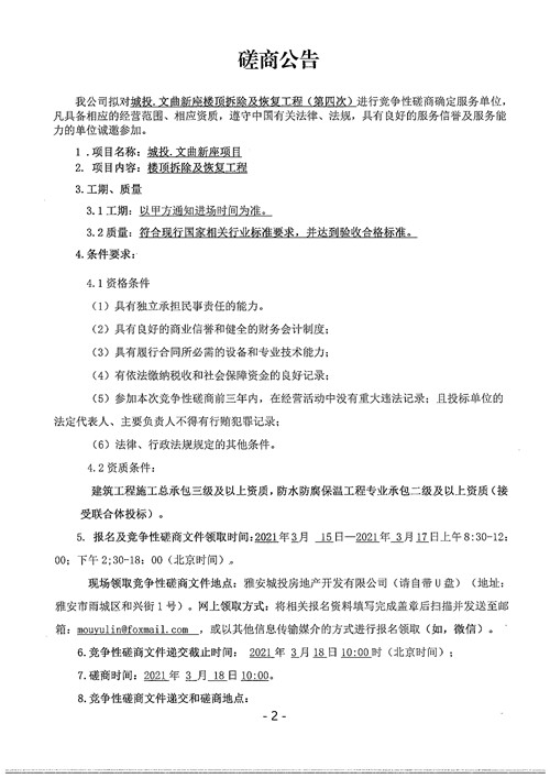城投地產(chǎn)公司文曲新座樓頂拆除及恢復(fù)工程(第四次)競爭性磋商公告