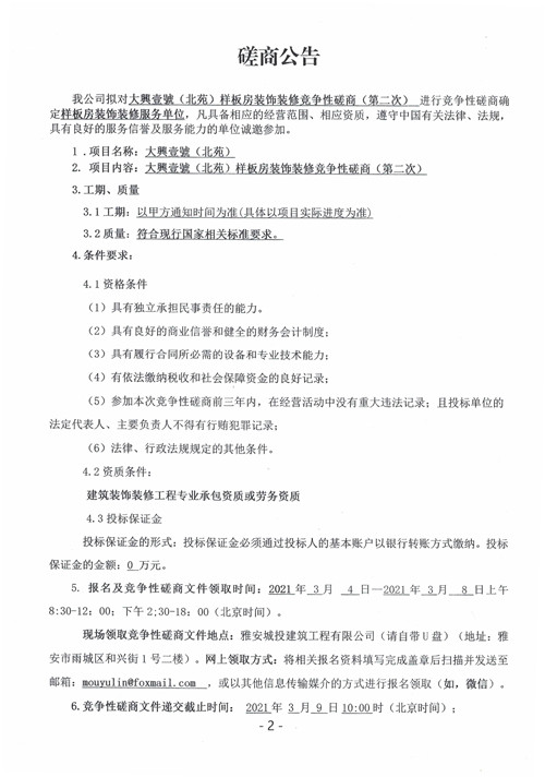 城投建工公司大興壹號(hào)(北苑)樣板房裝飾裝修競爭性磋商公告(第二次)