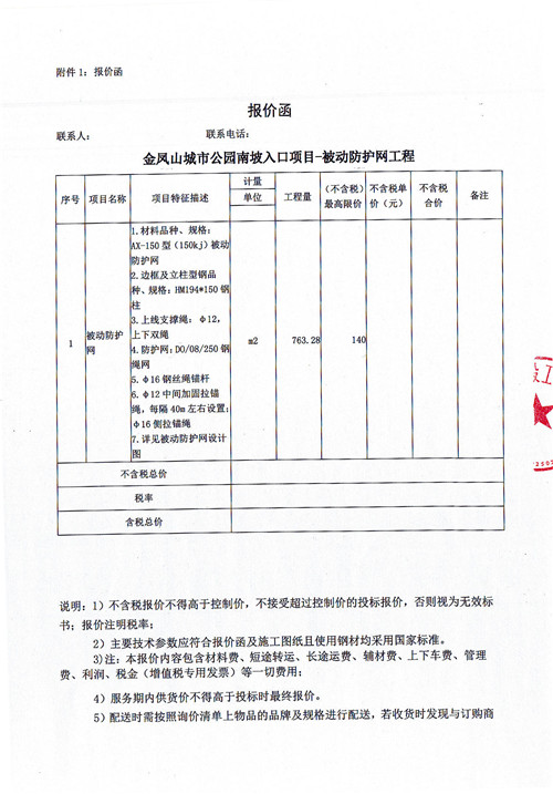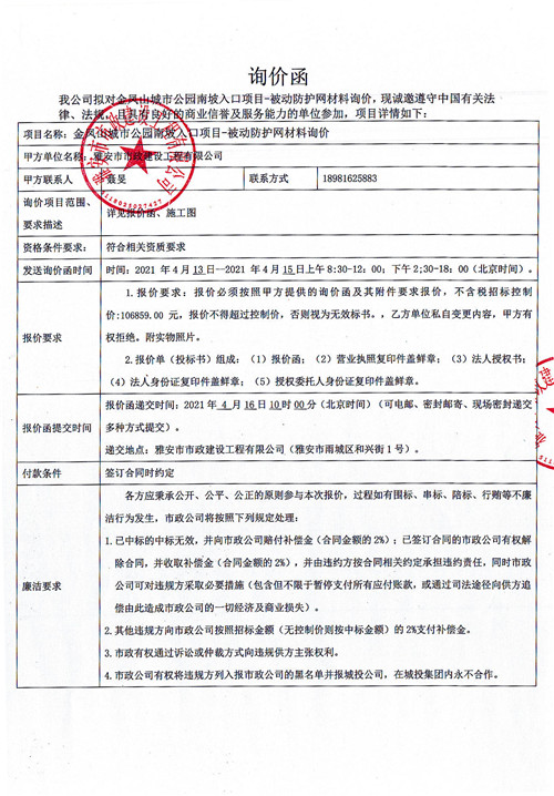雅安市政公司金鳳山公園南坡入口項(xiàng)目-被動(dòng)防護(hù)網(wǎng)材料詢價(jià)函