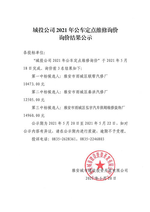 城投公司2021年公車定點維修詢價詢價結果公示
