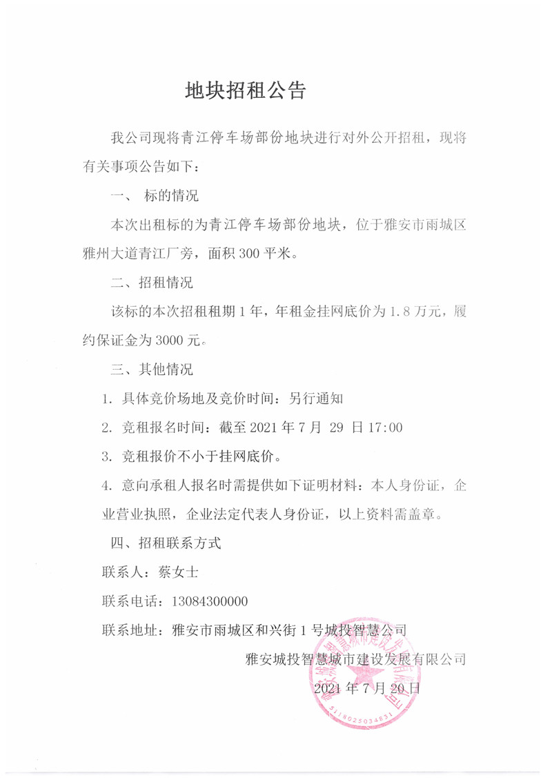 城投智慧公司青江停車場(chǎng)部分地塊招租公告(300㎡)