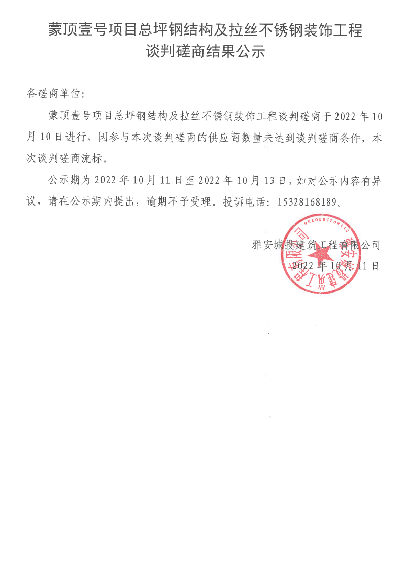 蒙頂壹號項目總坪鋼結構及拉絲不銹鋼裝飾工程談判磋商結果公示
