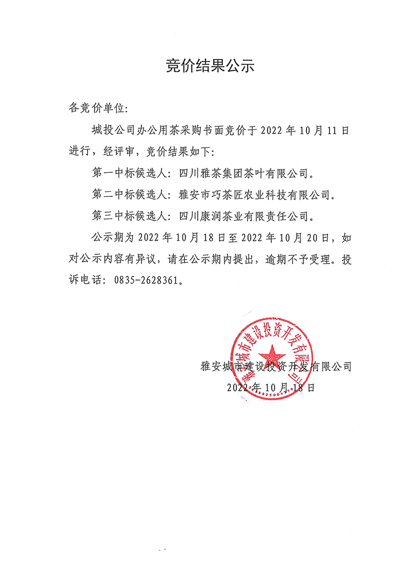 城投公司辦公用茶競(jìng)價(jià)結(jié)果公示