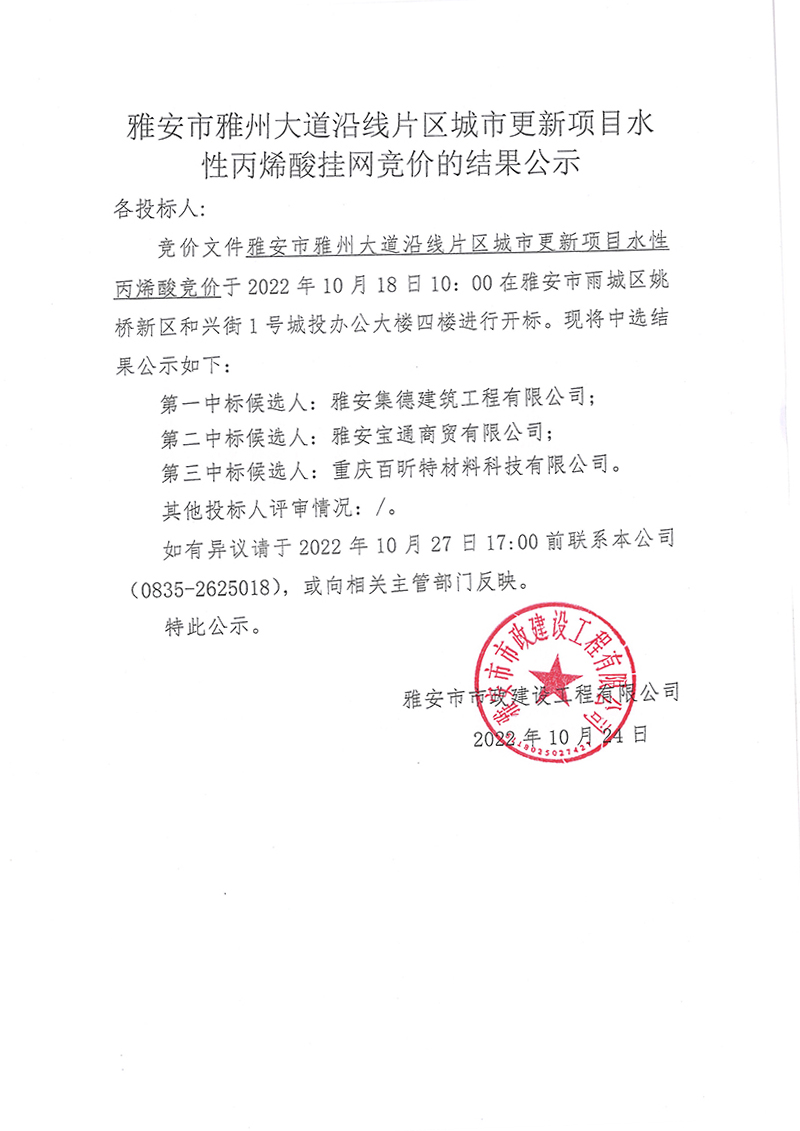 雅安市雅州大道沿線片區(qū)城市更新項目水性丙烯酸掛網(wǎng)競價的結(jié)果公示