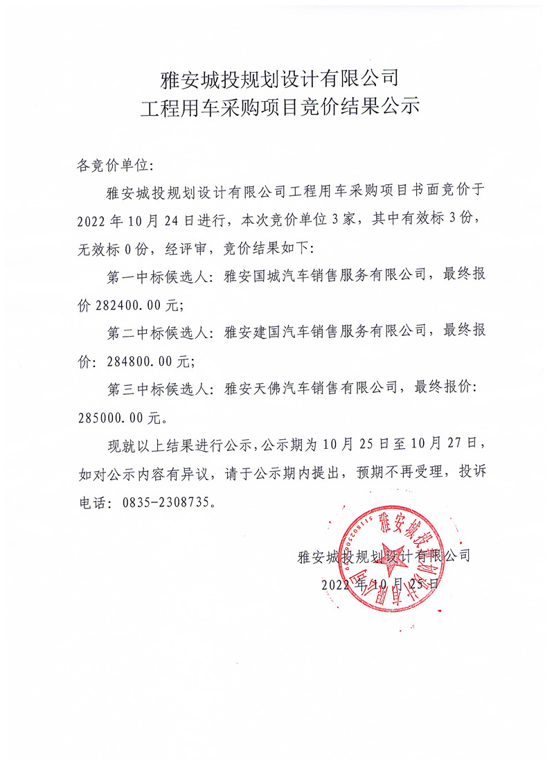 雅安城投規(guī)劃設(shè)計(jì)有限公司工程用車采購(gòu)項(xiàng)目競(jìng)價(jià)結(jié)果公示