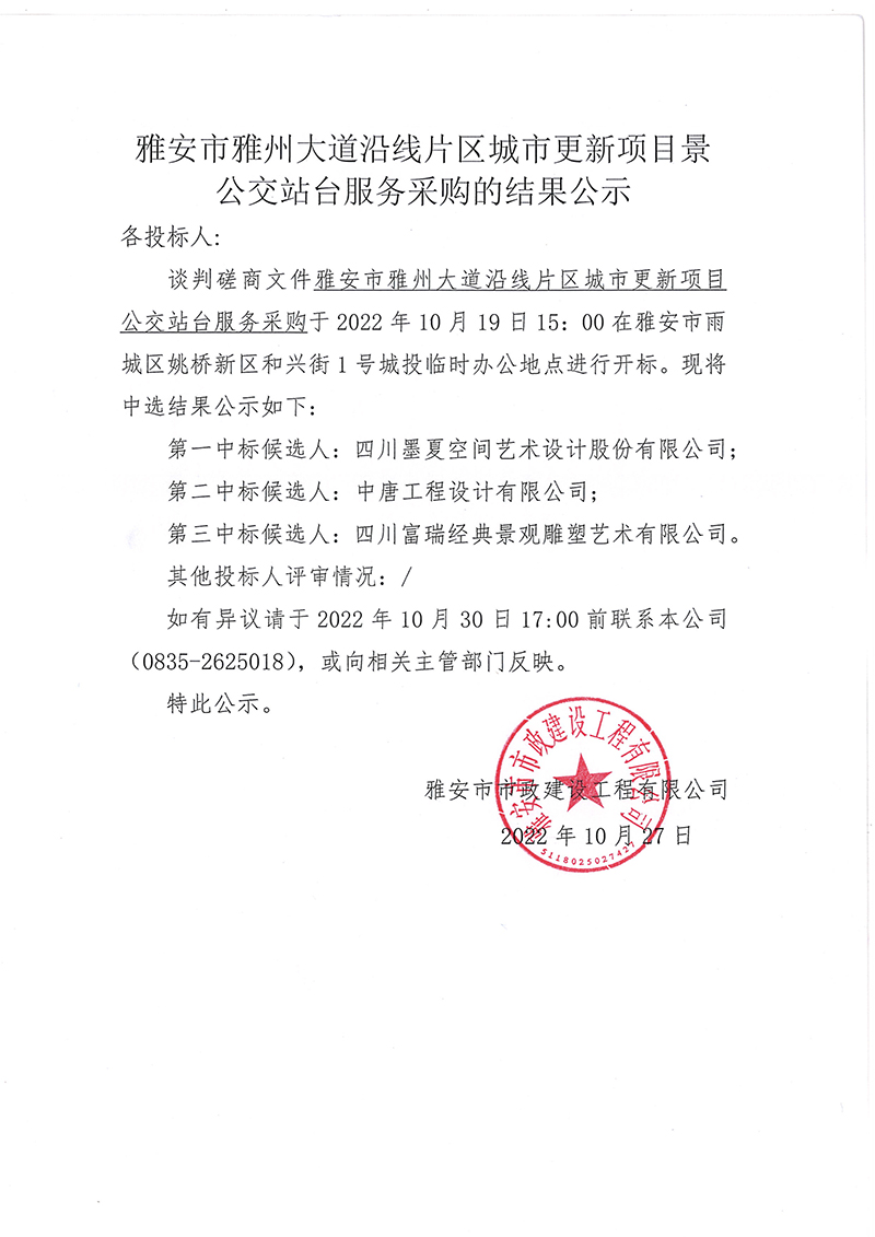 雅安市雅州大道沿線片區(qū)城市更新項(xiàng)目景觀公交站臺服務(wù)采購的結(jié)果公示
