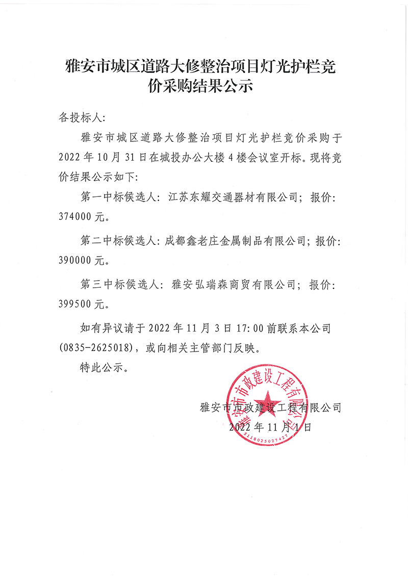 雅安市城區(qū)道路大修整治項目燈光護(hù)欄采購競價結(jié)果公告