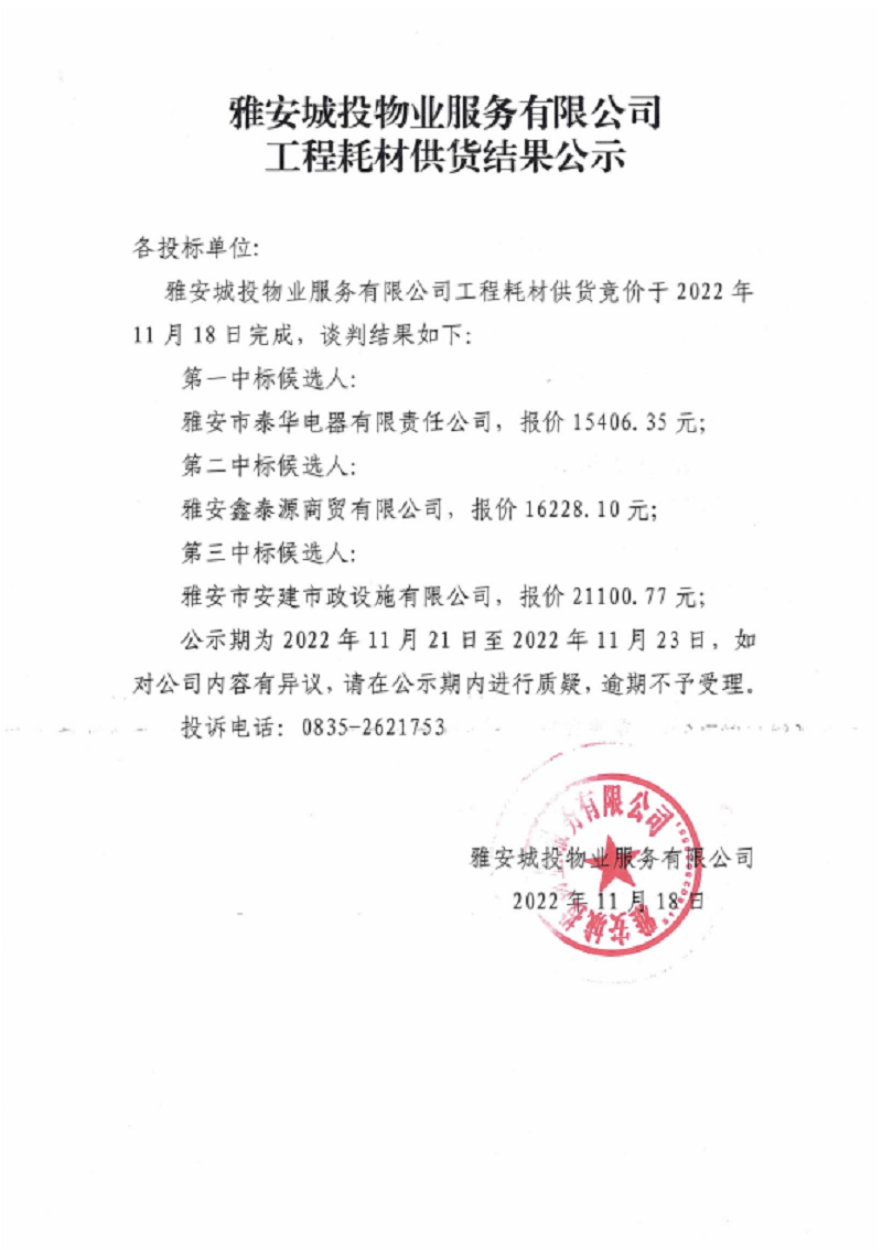 雅安城投物業(yè)服務(wù)有限公司工程耗材供貨結(jié)果公示