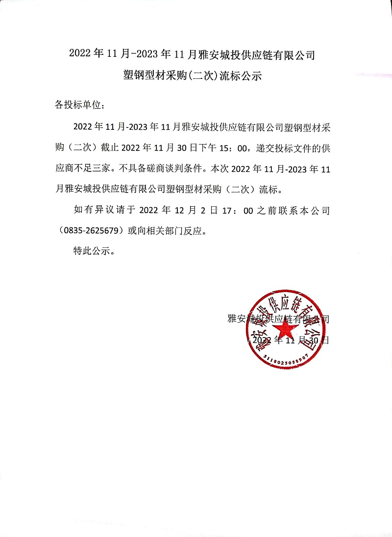 2022年11月-2023年11月雅安城投供應(yīng)鏈有限公司塑鋼型材采購(二次)流標(biāo)公示