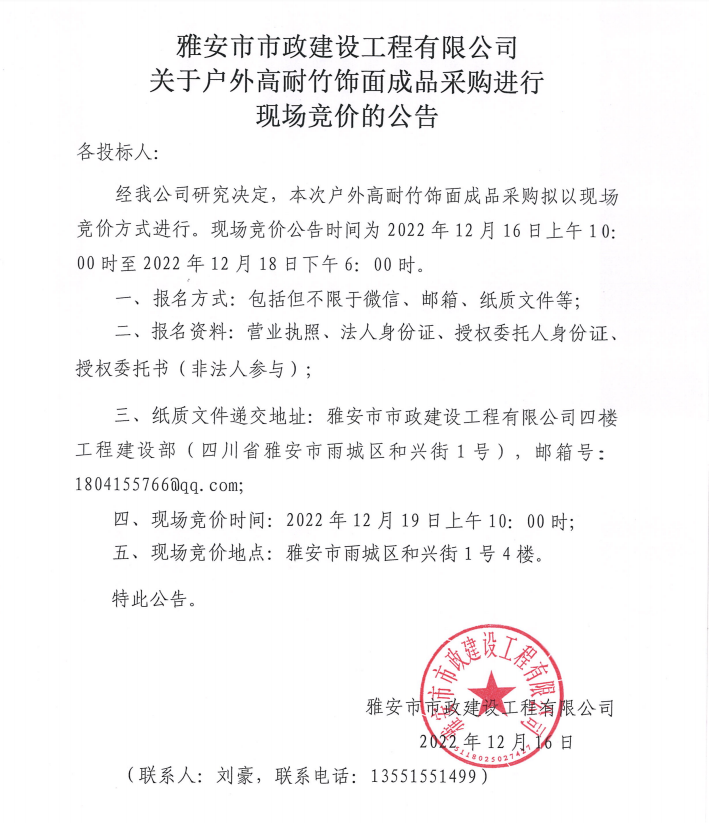 雅安市市政建設(shè)工程有限公司關(guān)于戶外高耐竹飾面成品采購進(jìn)行現(xiàn)場競價(jià)公告