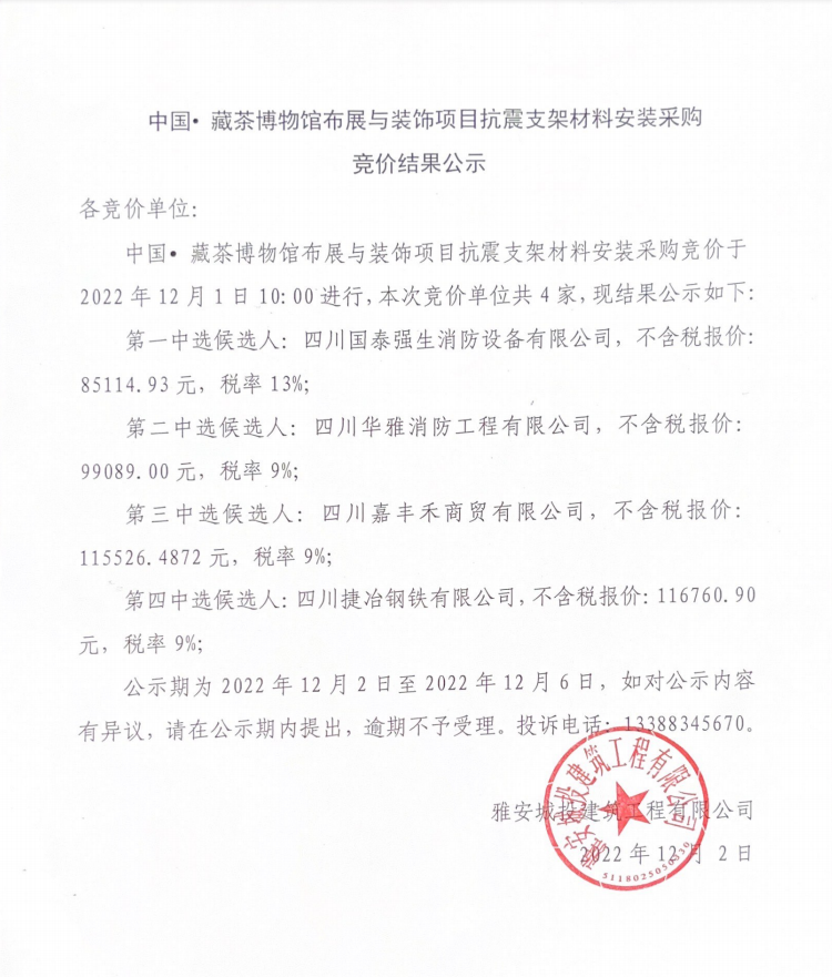 中國·藏茶博物館布展與裝飾項目抗震支架材料安裝采購競價結果公示