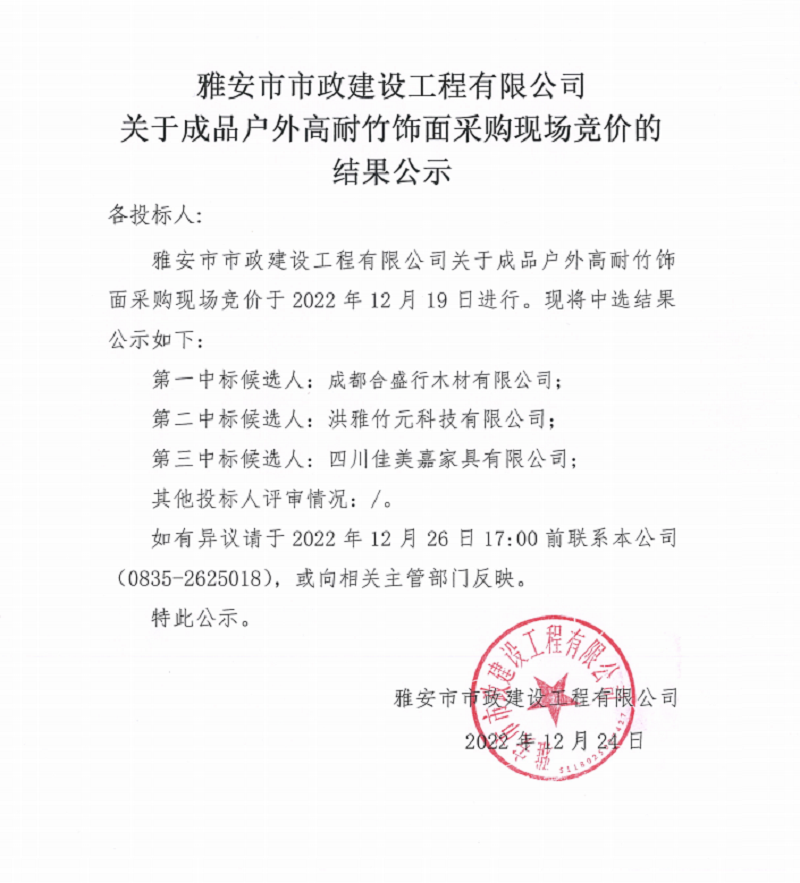 雅安市市政建設(shè)工程有限公司關(guān)于成品戶外高耐竹飾面采購(gòu)現(xiàn)場(chǎng)競(jìng)價(jià)結(jié)果公示