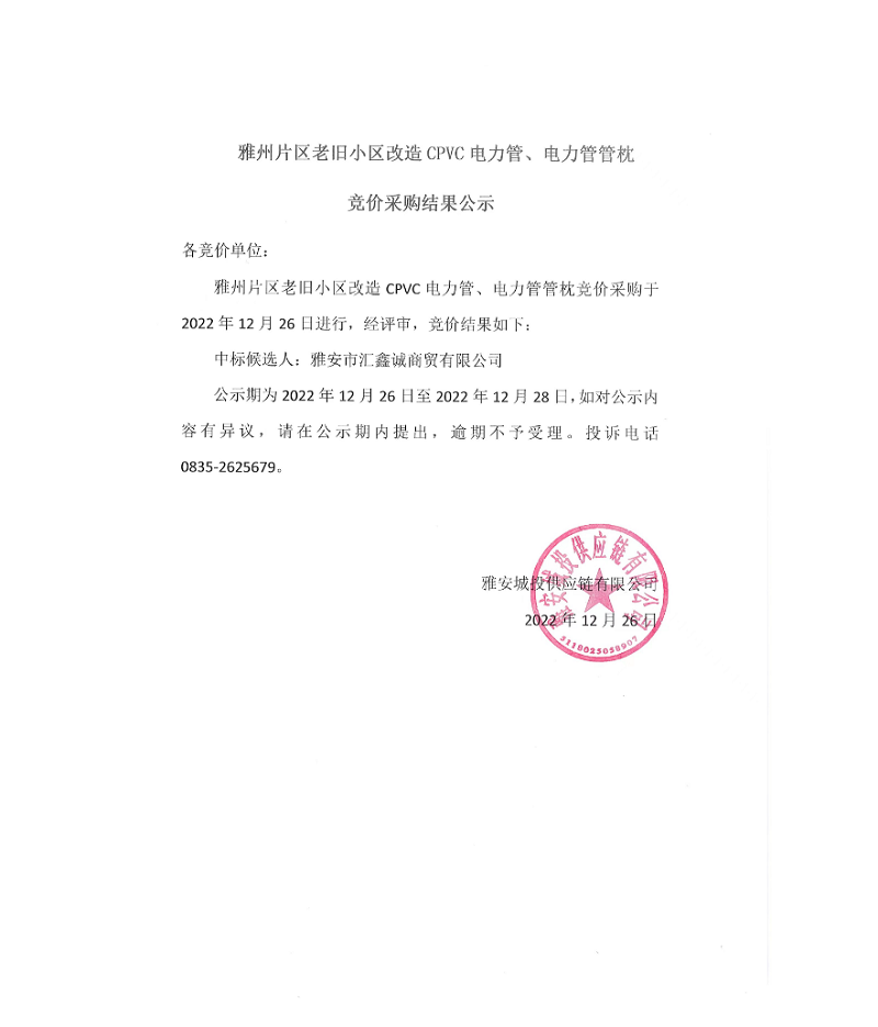 雅州片區(qū)老舊小區(qū)改造CPVC電力管、電力管管枕競(jìng)價(jià)采購(gòu)結(jié)果公示