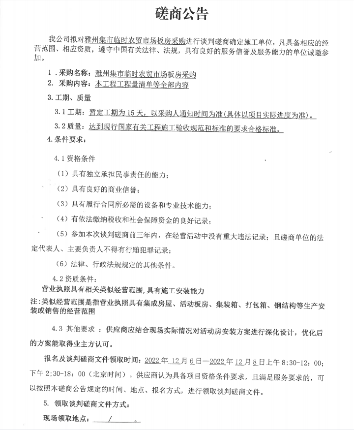 雅州集市臨時(shí)農(nóng)貿(mào)市場板房采購磋商公告