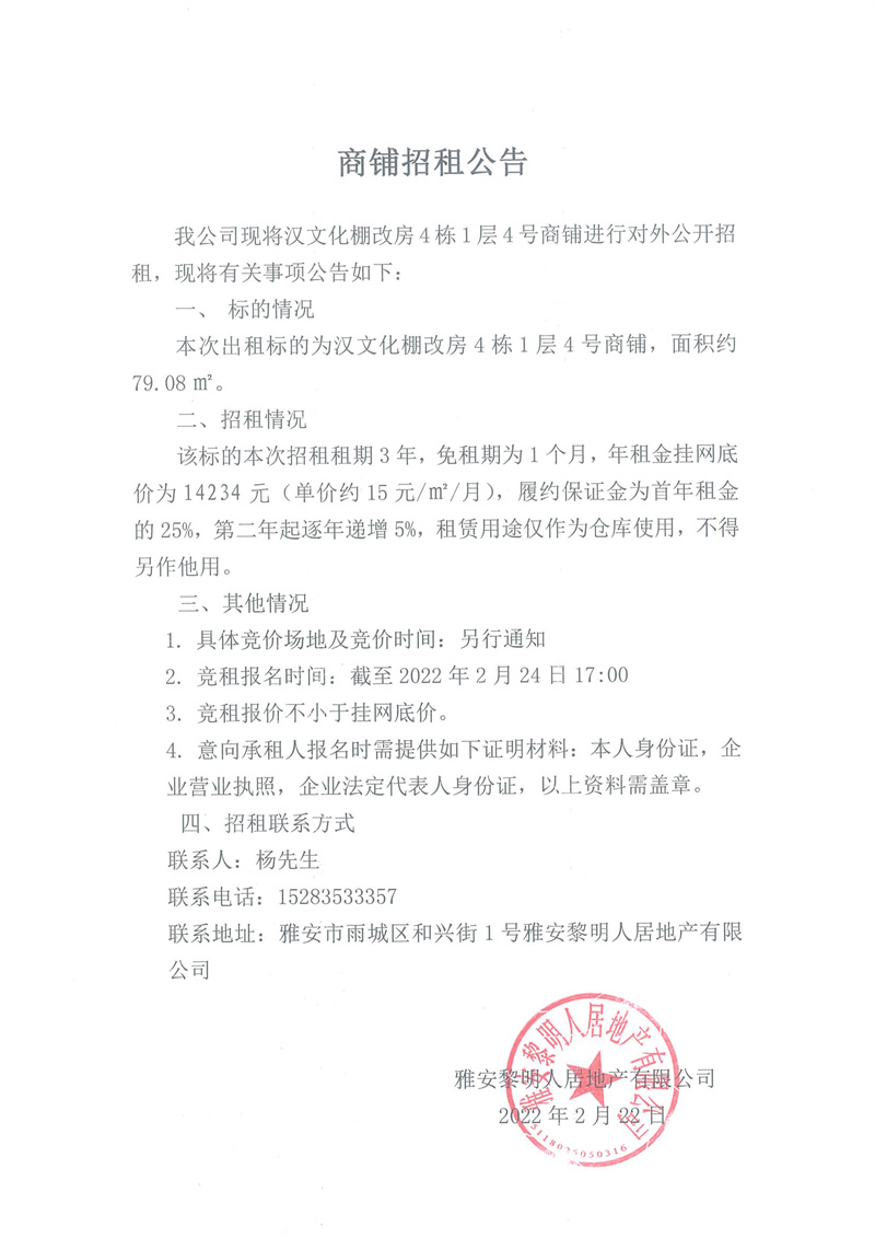 漢文化棚改房4棟1層4號商鋪招租公告