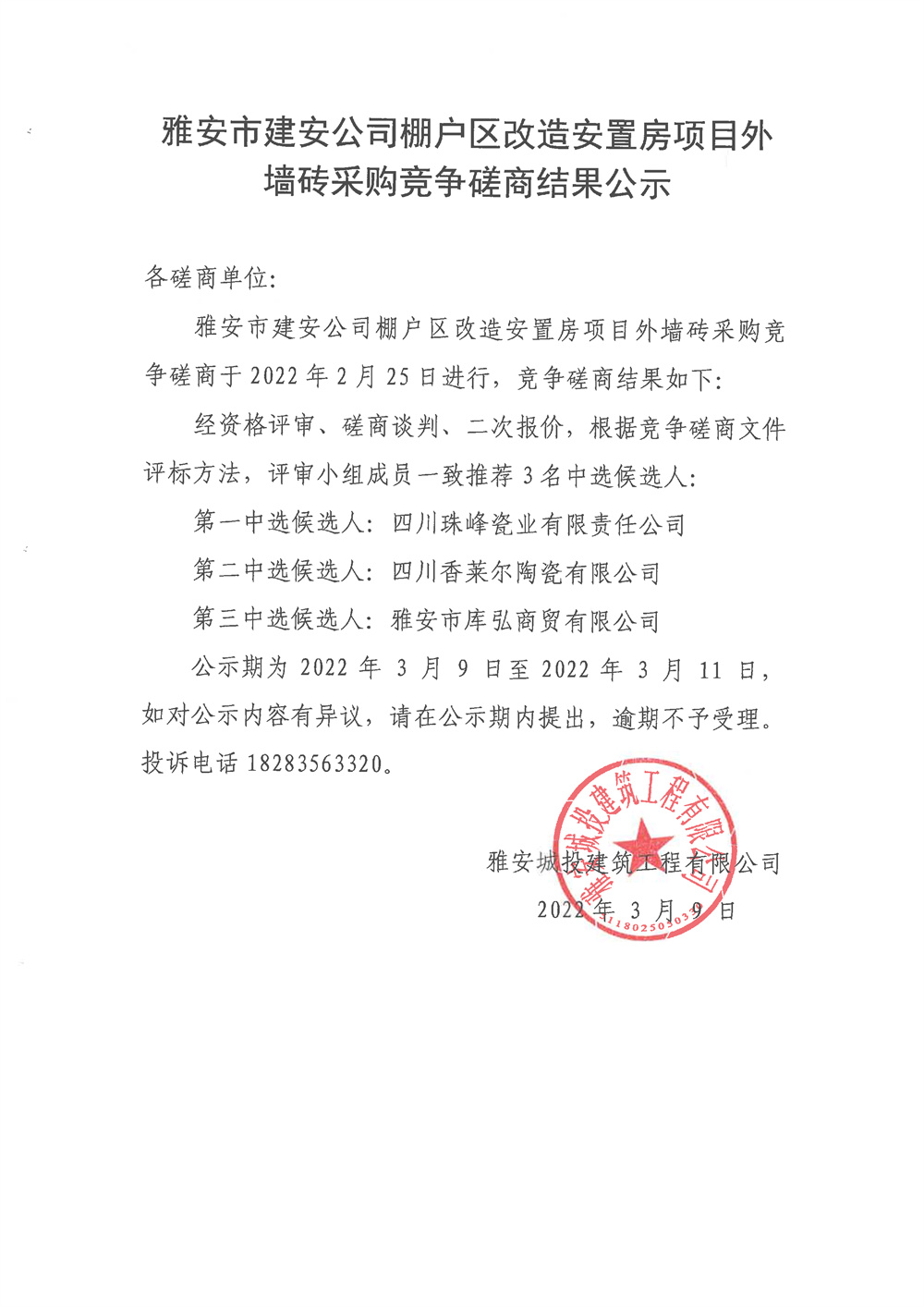 雅安市建安公司棚戶區(qū)改造安置房項(xiàng)目外墻磚采購(gòu)競(jìng)爭(zhēng)磋商結(jié)果公示