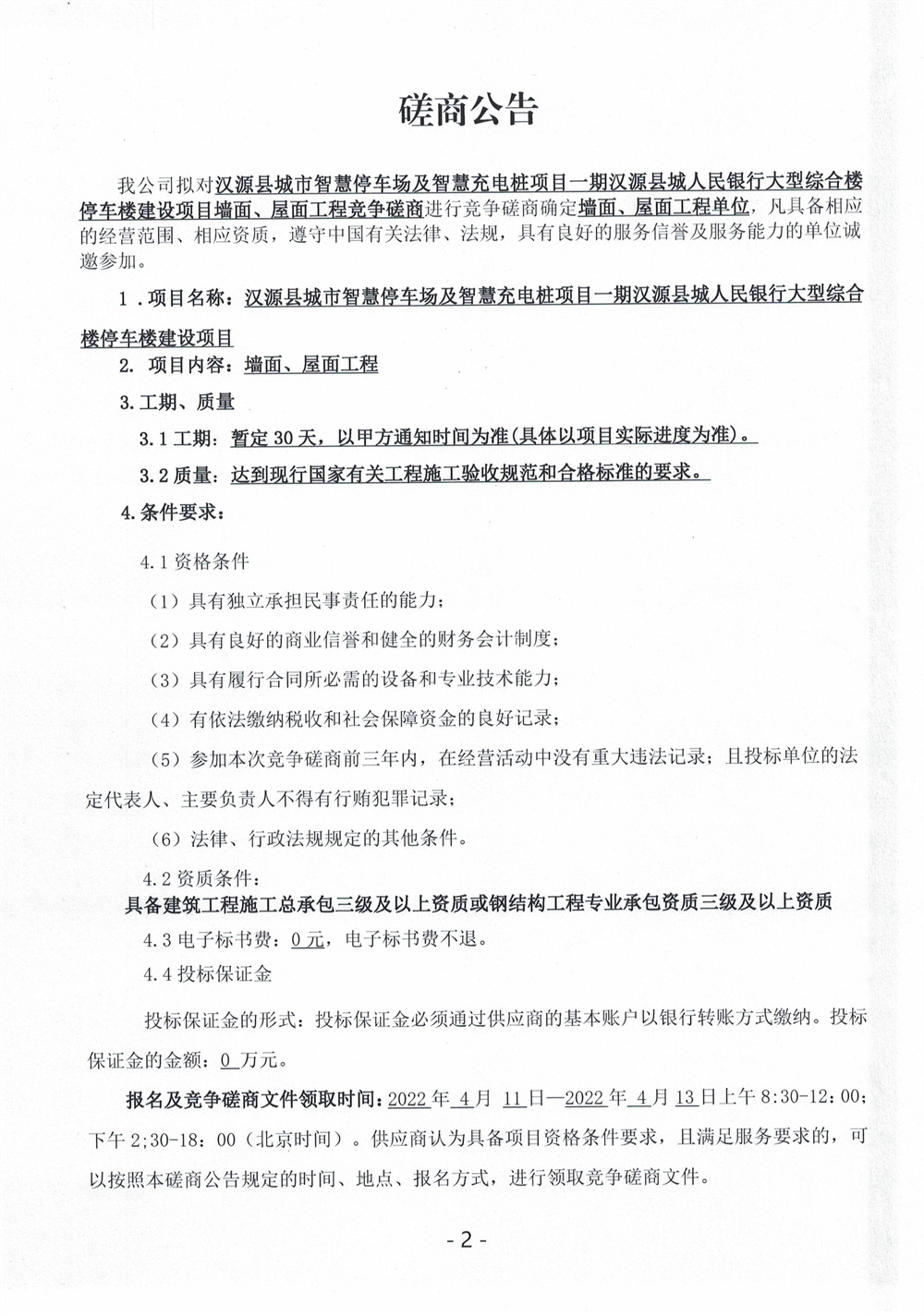 城投建工漢源縣城市智慧停車(chē)場(chǎng)及智慧充電樁項(xiàng)目一期漢源縣城人民銀行大型綜合樓停車(chē)樓建設(shè)項(xiàng)目墻面、屋面工程競(jìng)爭(zhēng)磋商公告