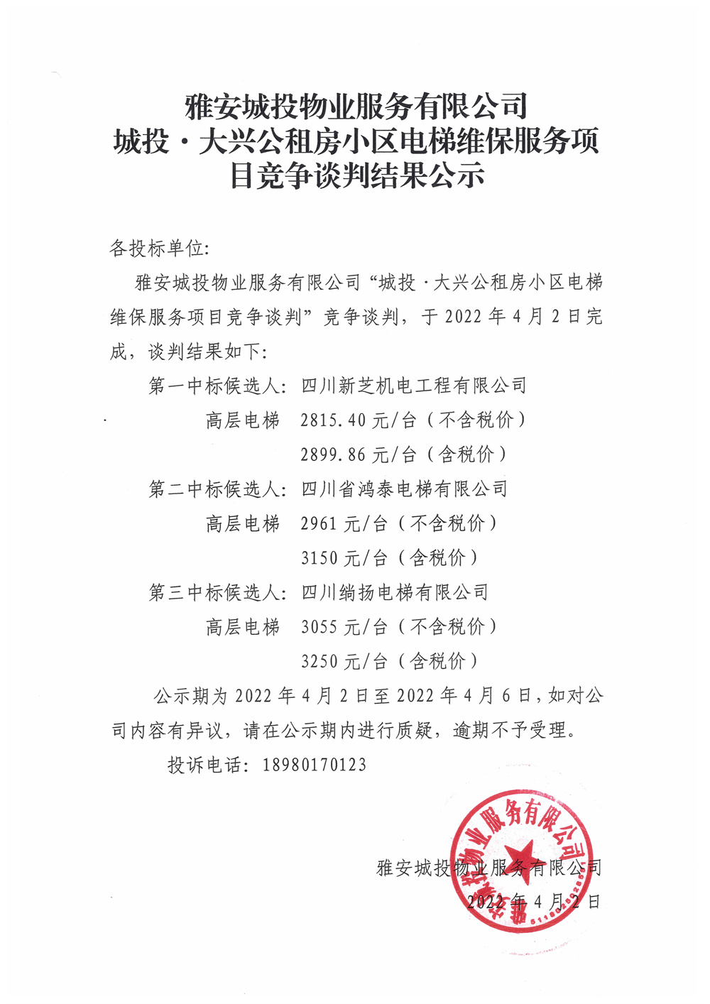 城投·大興公租房小區(qū)電梯維保服務項目競爭談判結果公示