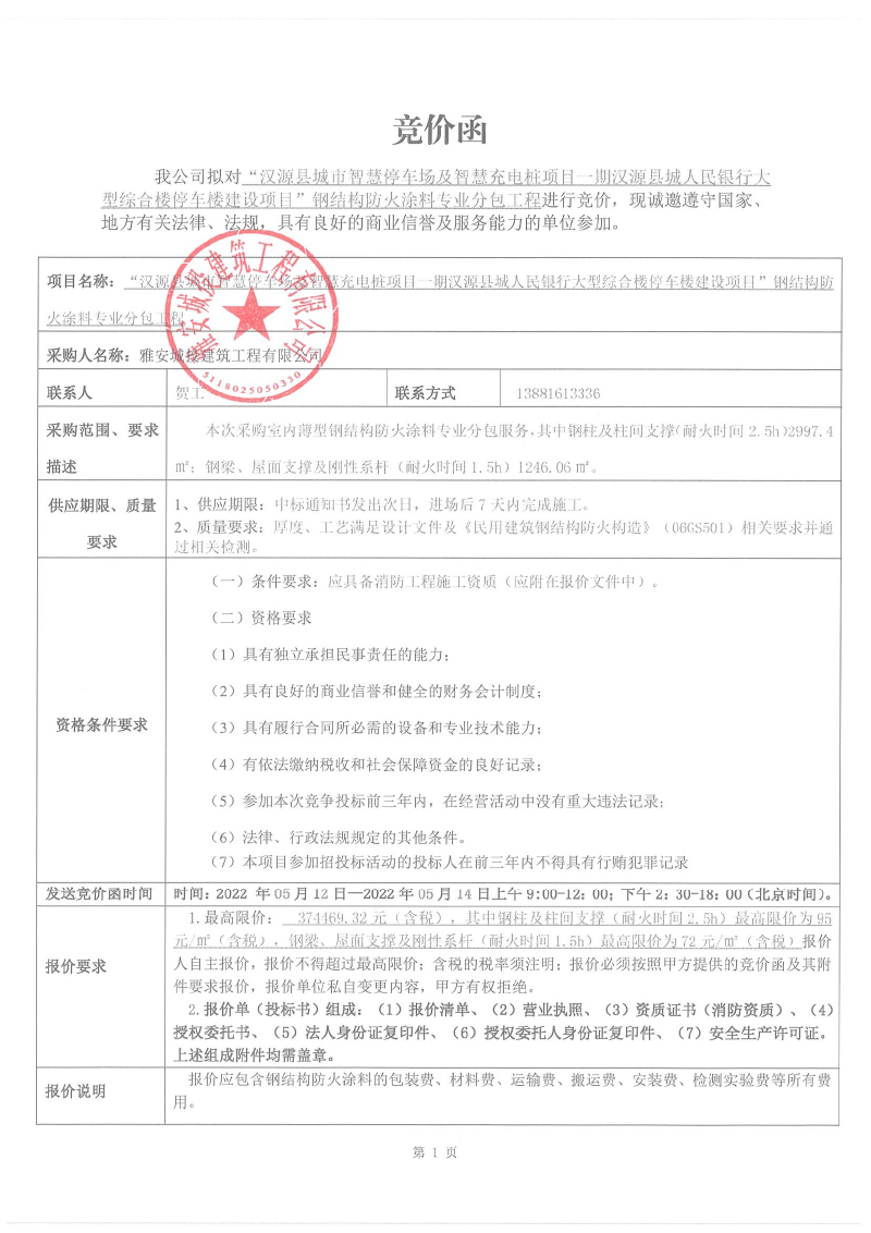 漢源縣城市智慧停車場及智慧充電樁項目一期漢源縣城人民銀行大型綜合樓停車樓建設(shè)項目防火涂料專業(yè)分包競價采購公告