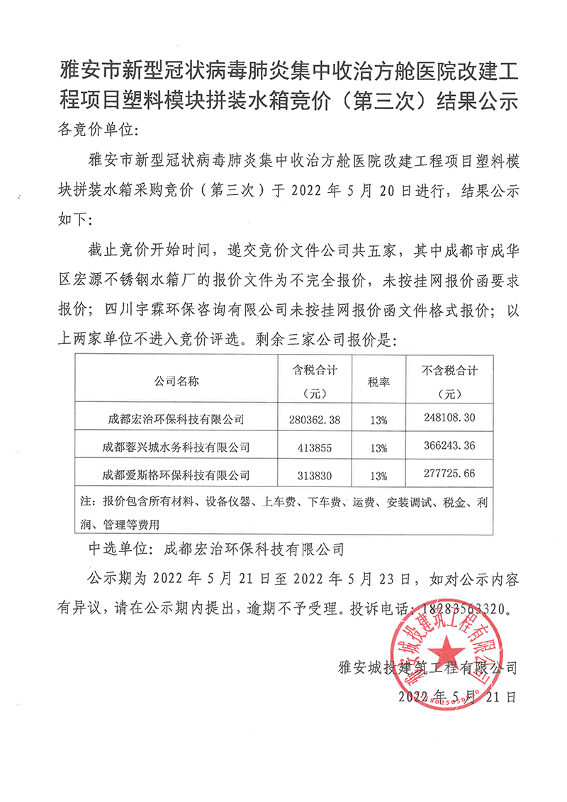 雅安市新型冠狀病毒肺炎集中收治方艙醫(yī)院改建工程項目塑料模塊拼裝水箱競價(第三次)結(jié)果公示