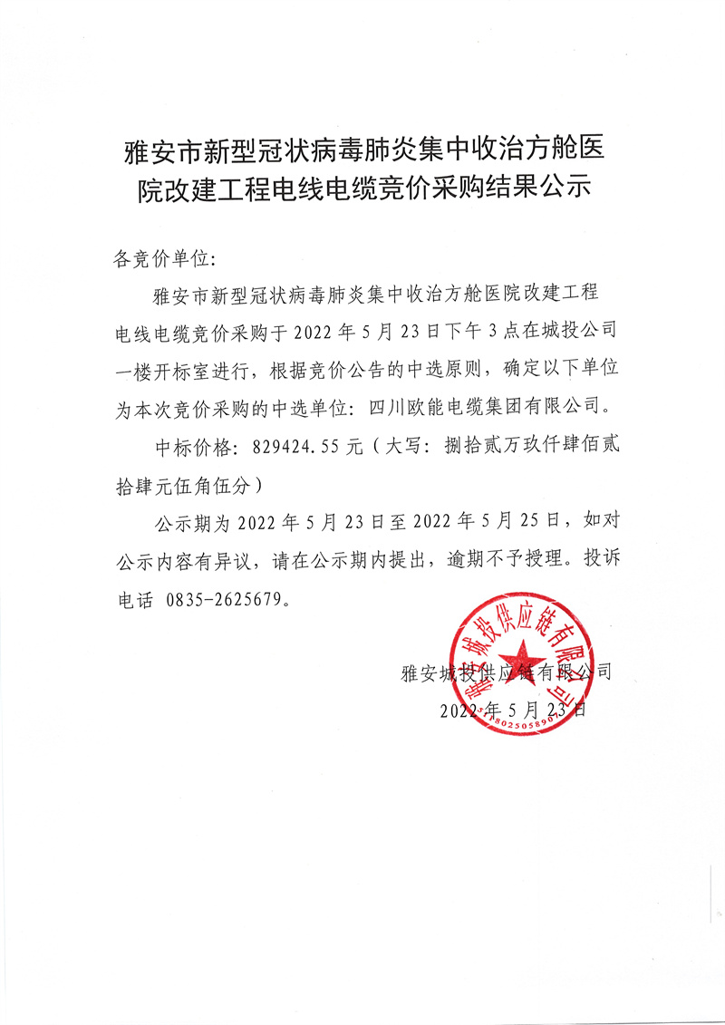 雅安市新型冠狀病毒肺炎集中收治方艙醫(yī)院改建工程電線電纜采購競價采購結(jié)果公示