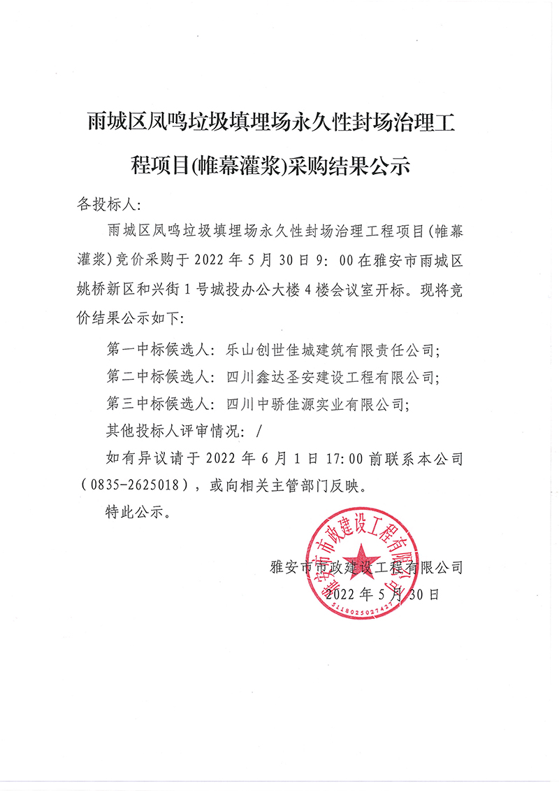 雨城區(qū)鳳鳴垃圾填埋場永久性封場治理工程項目(帷幕灌漿)采購結(jié)果公示