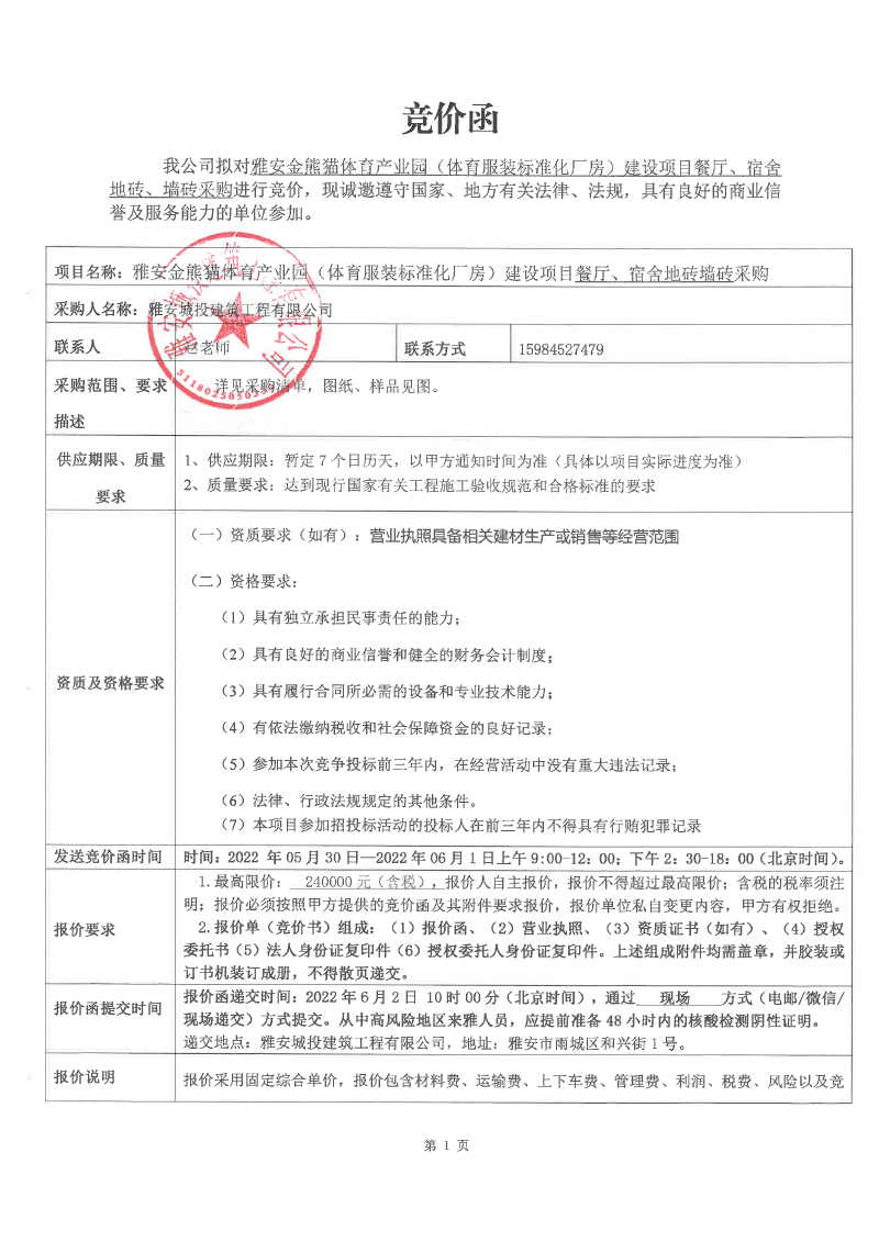 雅安金熊貓體育產(chǎn)業(yè)園(體育服裝標(biāo)準(zhǔn)化廠房)建設(shè)項目餐廳、宿舍地磚、墻磚競價采購