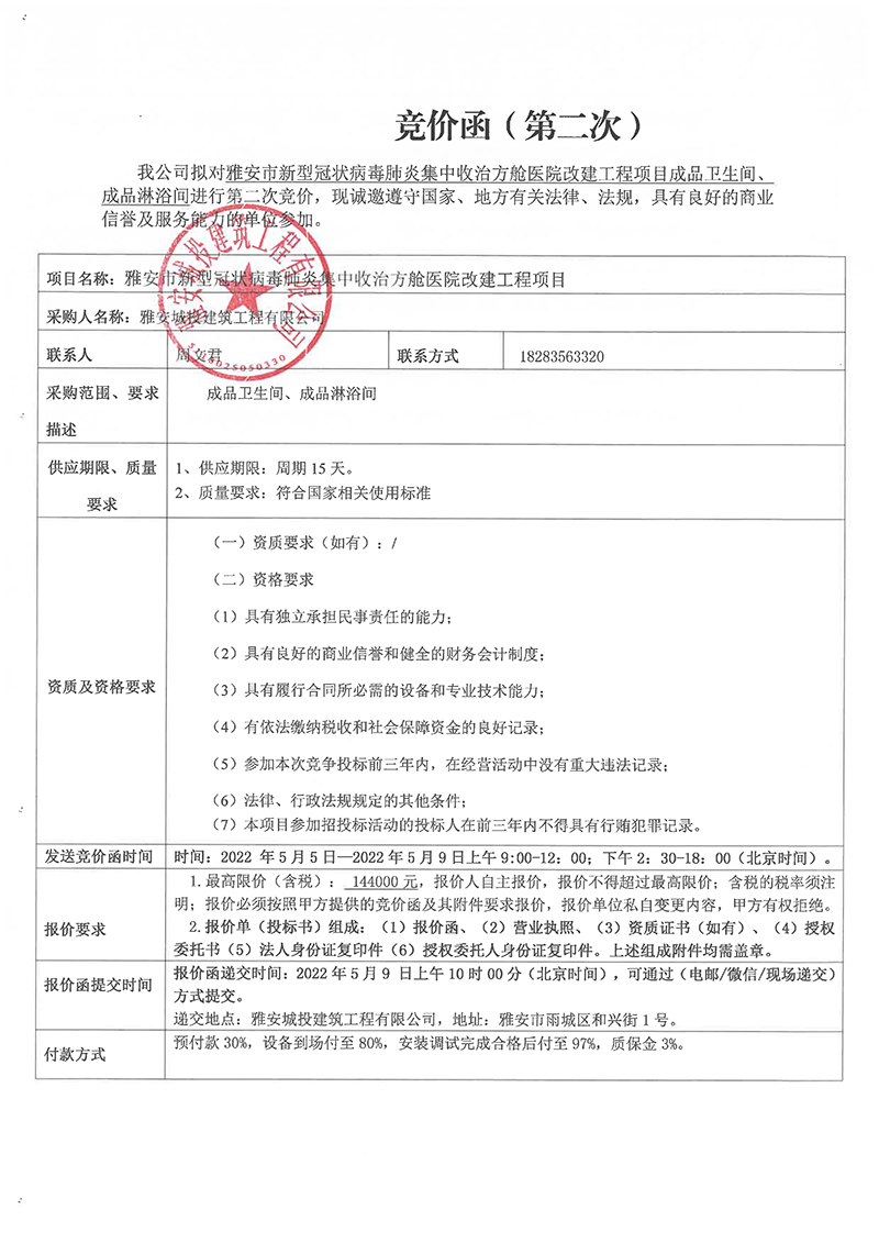 雅安市新型冠狀病毒肺炎集中收治方艙醫(yī)院改建工程項目成品衛(wèi)生間、淋浴間采購競價函(第二次)