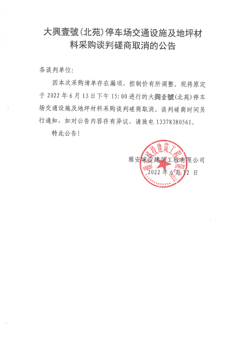 大興壹號(hào)(北苑)停車場(chǎng)交通設(shè)施及地坪材料采購談判磋商取消的公告
